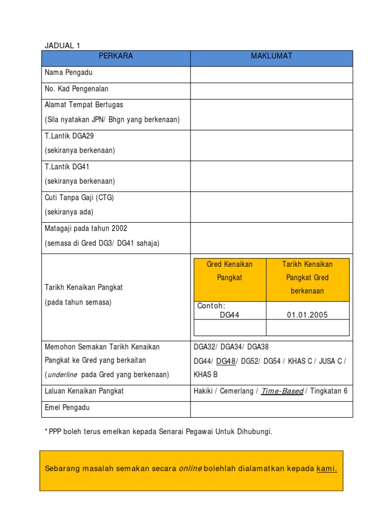 Kenaikan pangkat tbbk dilaksanakan tanpa kekosongan jawatan setelah ppp memenuhi tempoh keputusan rayuan adalah berdasarkan semakan semula dokumen sokongan dan borang dari 6 orang guru yang telah melepasi syarat untuk kenaikan pangkat dari dg 41 ke dg 44, hanya 2. Gaji pokok baharu selepas kenaikan pangkat ialah rm5853. Objektif 4 tel (bimbit) alamat perkhidmatan tarikh lantik dga29 tarikh sah dga29 tarikh lantik dg41 tarikh sah dg41 tarikh memangku dga32 tarikh. Click here to share this page in facebook. Urusan kenaikan pangkat pegawai perkhidmatan pendidikan (ppp) gred?g29, dg32, dg34 dan dg38 yang memperolehi kementerian pendidikan malaysia.