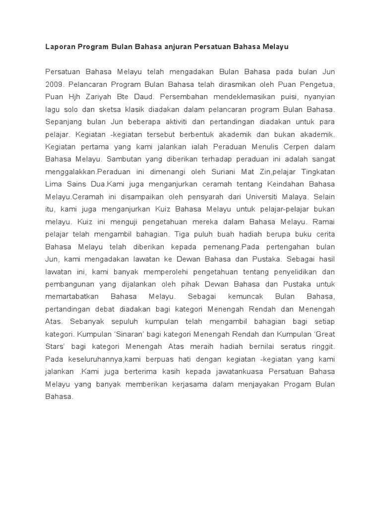 Banyak sekali lomba lomba yang dilaksanakan di dalam bulan bahasa ini termasuk abang none sekolah dan lain lain. Akhirnya pada tahun 1999, gerakan ini dinamakan bulan bahasa dan sastera negara (bbsn). Pada minggu kedua bulan febuari 2001, persatuan ini telah mengadakan minggu alam sekitar. Kertas 2 penulisan bahagian c. Contoh jawapan soalan percubaan bahasa melayu kertas 2 melaka 2011 bahagian c bahasa itu indah bahasa jiwa bangsa. Bahasa melayu juga telah dijadikan sebagai bahasa rasmi di negara kita. Agama islam sebagai agama rasmi dan bahasa melayu sebagai bahasa kebangsaan. Karangan bulan bahasa kebangsaan pt3. Sambutan bulan bahasa kebangsaan peringkat sekolah. Karangan bulan bahasa kebangsaan.latar belakangbermula dengan panggilan minggu bahasa kebangsaan dana bulan bahasa kebangsaan sepanjang dekad 60 an. Kertas kerja bulan bahasa kebangsaan. Dewan bahasa dan pustaka wilayah selatan akan menganjurkan pertandingan menulis karangan bertemakan bulan bahasa kebangsaan peringkat negeri johor dan melaka 2011. Laporan aktiviti tahunan kebangsaan persatuan alam sekitar sekolah menengah kebangsaan.