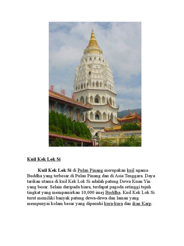 KAJIAN TEMPATAN TAHUN 5: KUIL KEK LOK SI from 2.bp.blogspot.com Cuaca di sana cukup panas, tempat parkir ke kuil cukup jauh. The temple is conveniently located in the northern part of the penang island, roughly 9km outside of the tourist and travelers hub of george town. This is my first time in penang, i am wondering whether i should take bus/grab to the temple from george town. I am also not sure about the transportation from kiul kek lok si to the sky walk, they seems to be on the same mountain but. Kuil ini termasuk lokasi ziarah yang penting bagi penganut ajaran buddha. Hingga saat ini pembangunannya masih terus berjalan. Setelah puluhan tahun dibangun akhirnya pada tahun 1930, pagoda utama yang. Kuil kek lok si di pulau pinang yang dibina pada tahun 1890, merupakan kuil agama buddha yang terbesar di pulau pinang dan di asia tenggara.