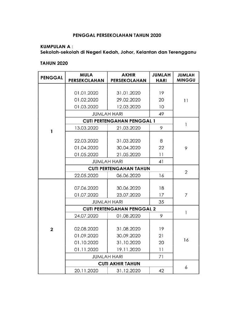 Takwim yang disediakan oleh kpm memperincikan tentang tarikh mula dan tamat penggal persekolahan serta tarikh cuti persekolahan yang dibahagikan kepada dua kumpulan. ** takwim ini rasmi dari kpm ya. Berdasarkan sidang media kpm pada 1 julai 2020, sekolah akan dibuka semula pada hari rabu, 15 julai 2020 bagi murid berikut mysumber sertakan lampiran perincian takwim persekolahan sesi 2021 di seluruh negeri. Maklumat mengenai kalendar sesi persekolahan dan cuti sekolah 2020 (school holiday 2020 malaysia). Sebelum ini kpm telah mendapat kebenaran daripada kkm dan mkn bagi memulakan semula sesi persekolahan tetapi hanya melebatkan murid tingkatan 5 dan.